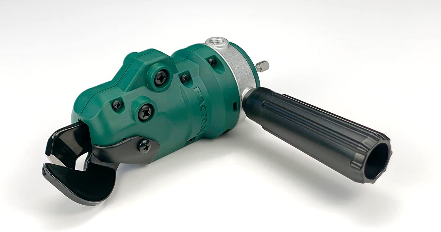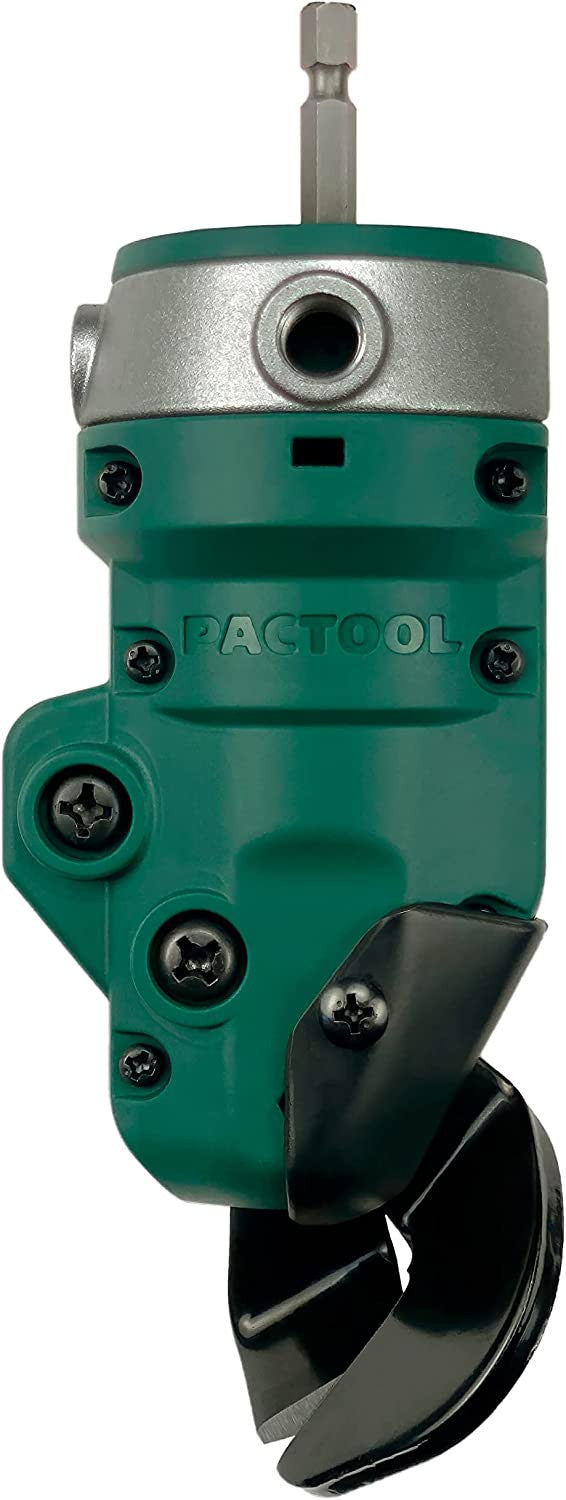 The PacTool SS701 Snapper Shear attaches to any 18-volt or higher cordless drill motor, enabling you to cut 18-gauge galvanized steel, aluminum, and copper. It's cleaner, faster, and minimizes metal chips. The ergonomic universal rotating shear head allows you to cut any shape easily, saves hours, adds convenience, and helps eliminate excess mess on any job site. Detach and replace worn-down tempered steel blades with a new replacement blade to keep the job moving.